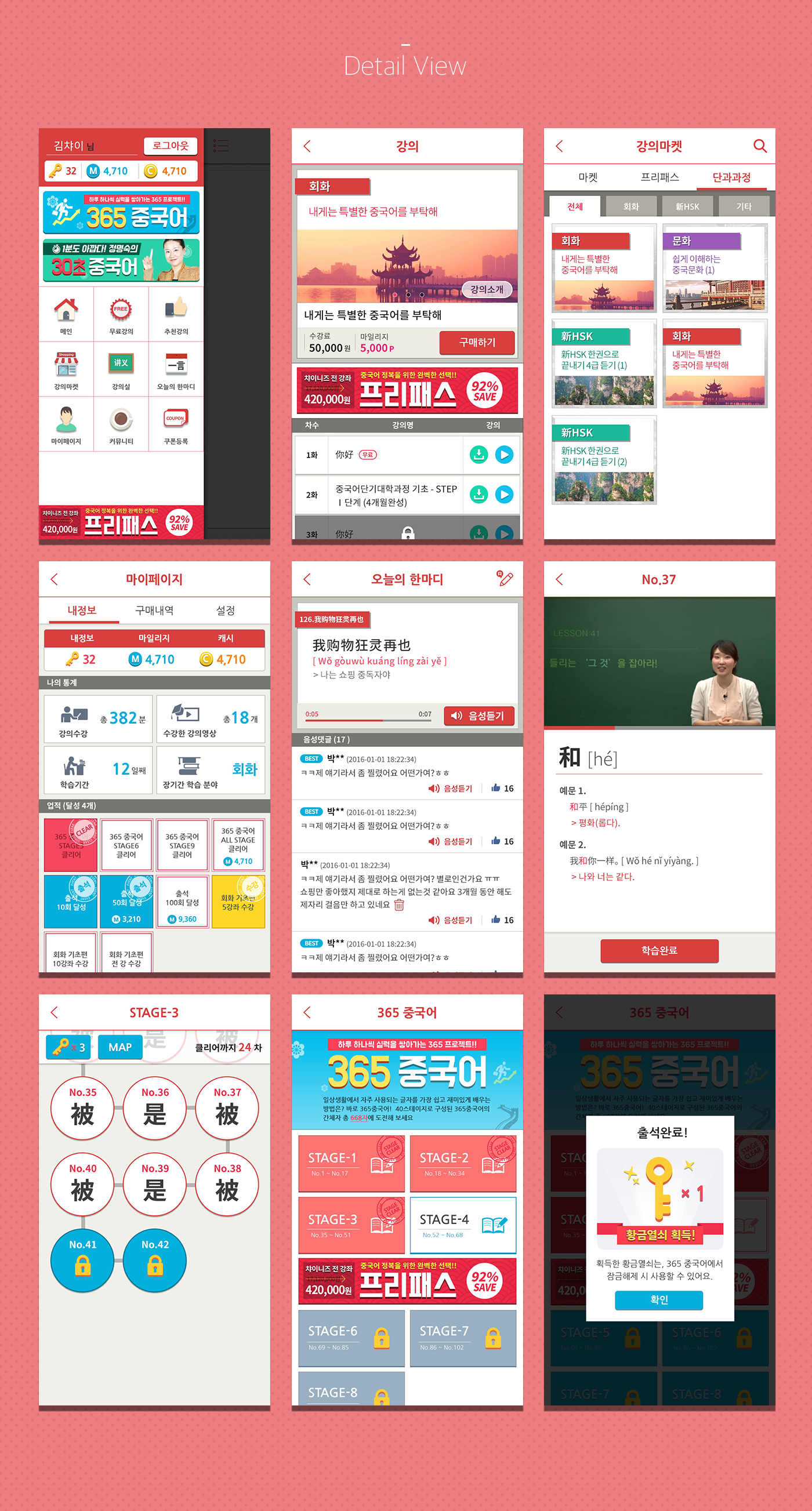 중국어 교육회사로 기존 상품들과의 차별을 위한 컬러 선택과 ‘무림고수'컨셉을 정하여 사자성어 카피와 사용자에게 친숙하면서도 새로운 중국어 교육의 이미지를 만들었다.